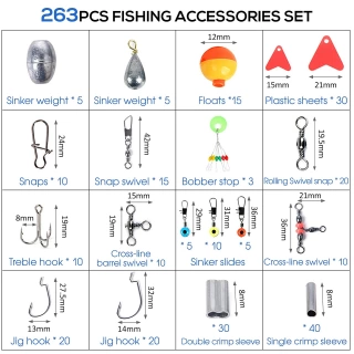 Get fully equipped for any fishing trip with this 263-piece Fishing Accessories Set. Organized in a durable tackle box, it includes everything you need: multi-tool pliers, hooks, sinkers, swivels, snaps, floats, sleeves, and more. Perfect for beginners and experienced anglers alike. The compact box keeps every piece neatly sorted, making it easy to carry and store.